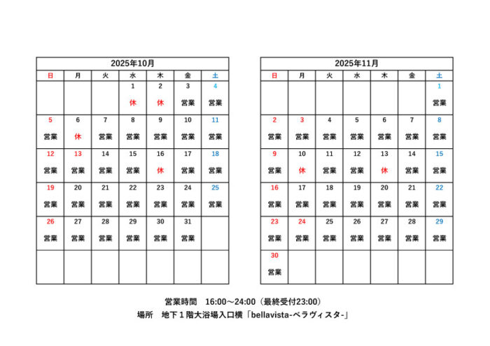 エステティックサロン「ベラヴィスタ」営業日カレンダー
