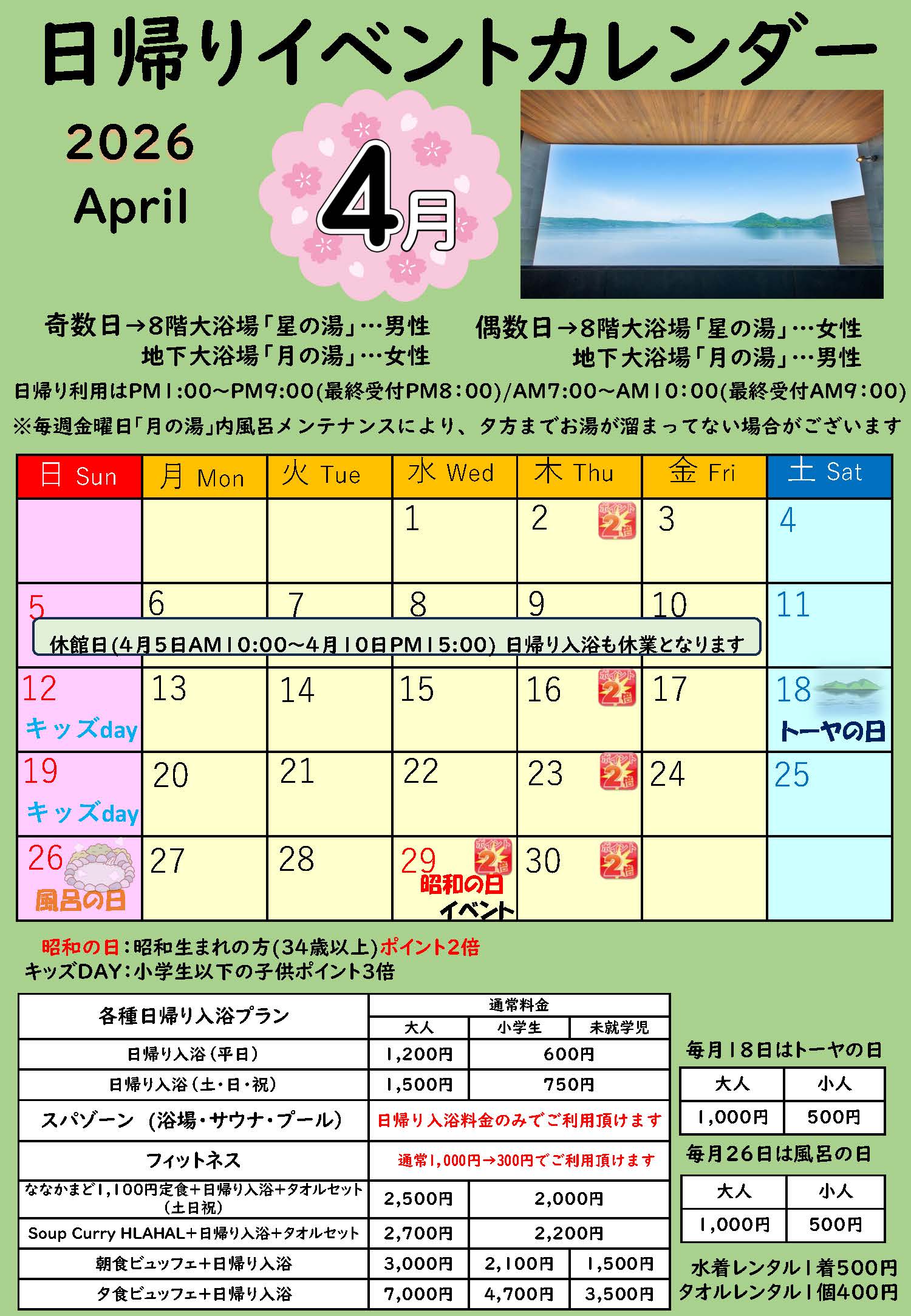 なお、館内メンテナンスに伴う休館日および一部日帰りプランの料金変更がございます。詳しくはカレンダーをご確認ください。